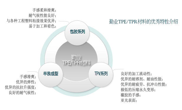 勤業(yè)擁有十多年TPE/TPR的銷售、研發(fā)經(jīng)驗(yàn),憑借對(duì)TPE/TPR獨(dú)到的理解,借鑒眾家之長(zhǎng),獨(dú)立開(kāi)發(fā)出了三大系列,一百多種規(guī)格的TPE/TPR材料,廣泛運(yùn)用于電子電器、汽車、醫(yī)療、文體、建筑等眾多領(lǐng)域。